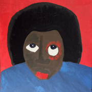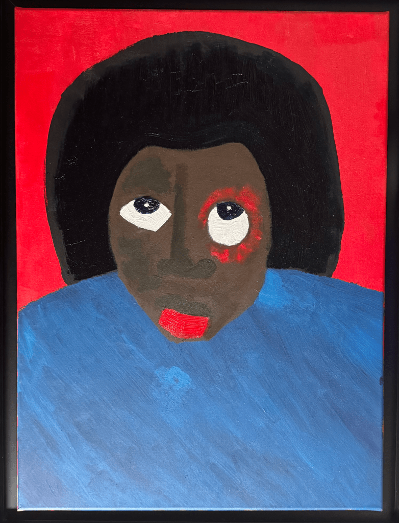 Œuvre de format intime, elle nous invite à entrer dans le monde intérieur de l’artiste, topos de silence, de mémoire et de simplicité figurative. Par son geste pictural, Blasius s’impose ici comme un conteur visuel, offrant un portrait qui dépasse l’individu pour toucher le grenat du coeur dans le fond et dans la forme.